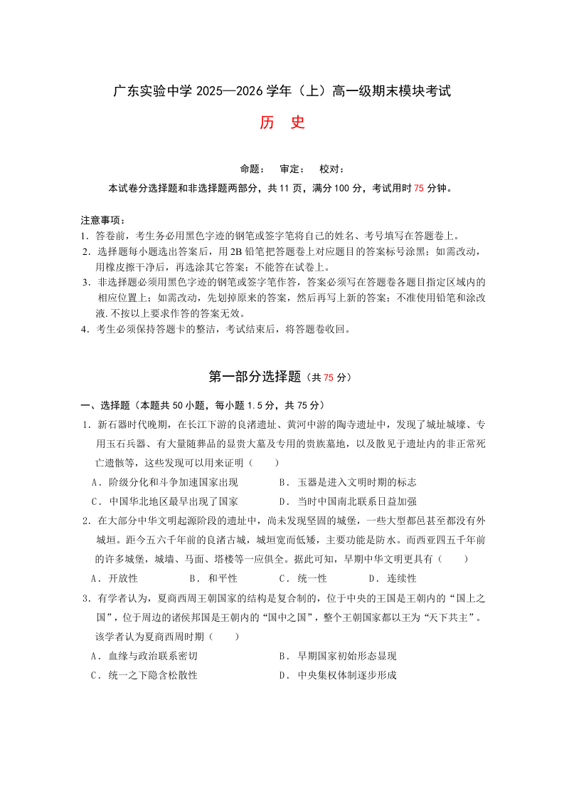 高一历史--广东实验中学2025-2026学年高一上学期期末考试