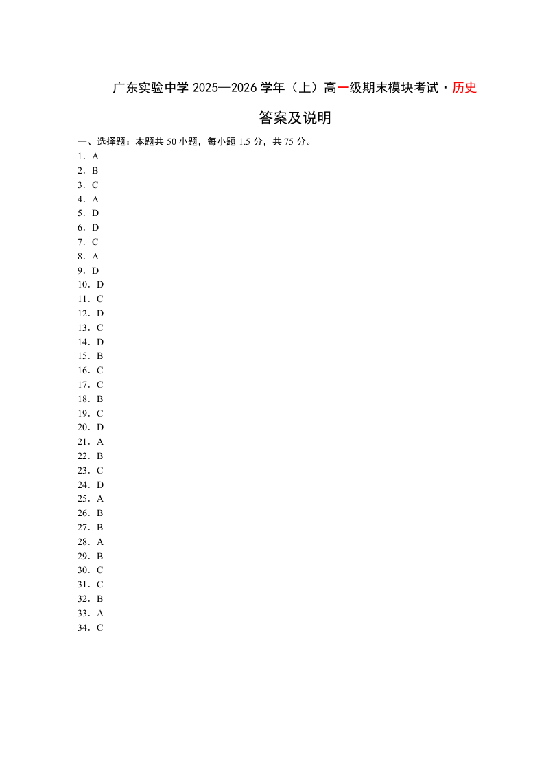 高一历史答案--广东实验中学2025-2026学年高一上学期期末考试
