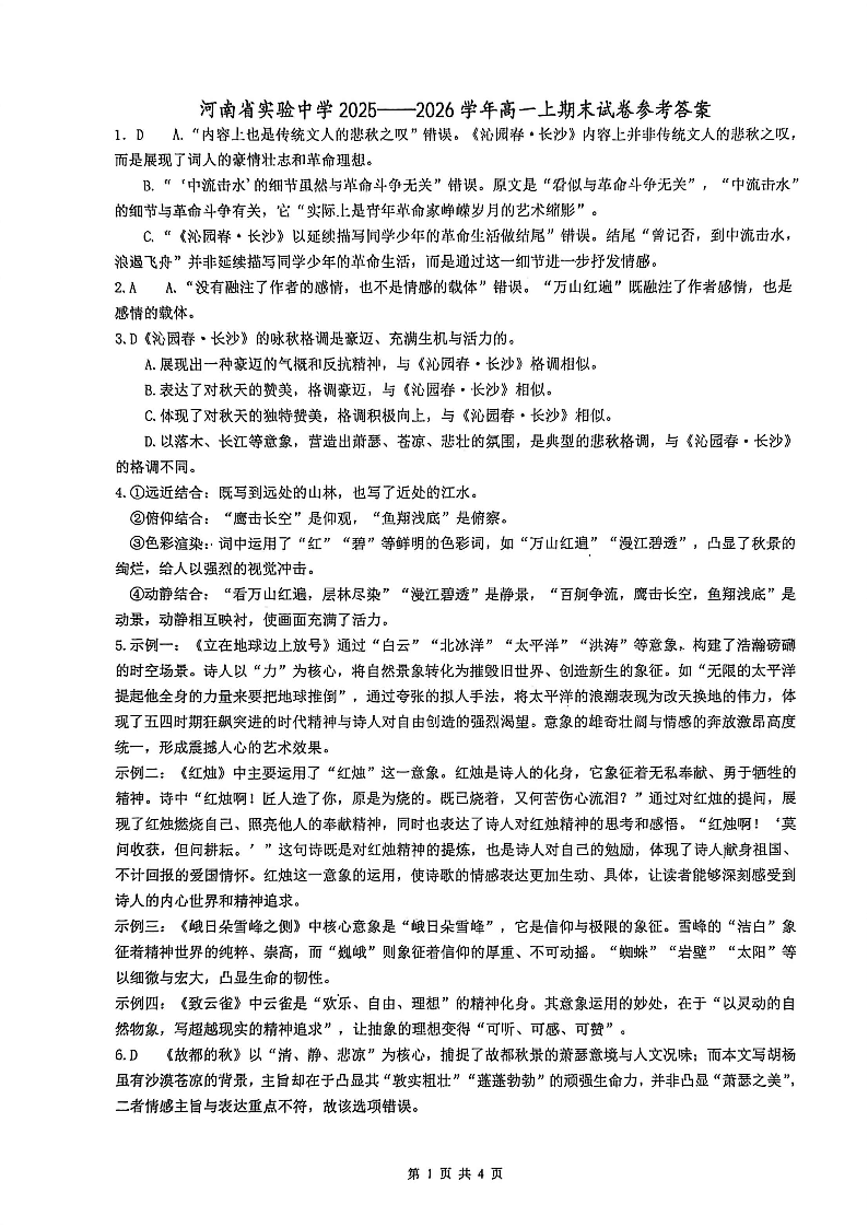 高一语文答案--河南省实验中学2025-2026高一上学期期末考试