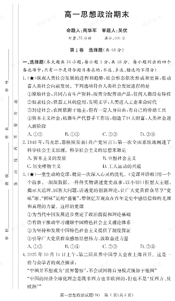 高一政治--湖南省长郡中学2025-2026高一上学期期末考试