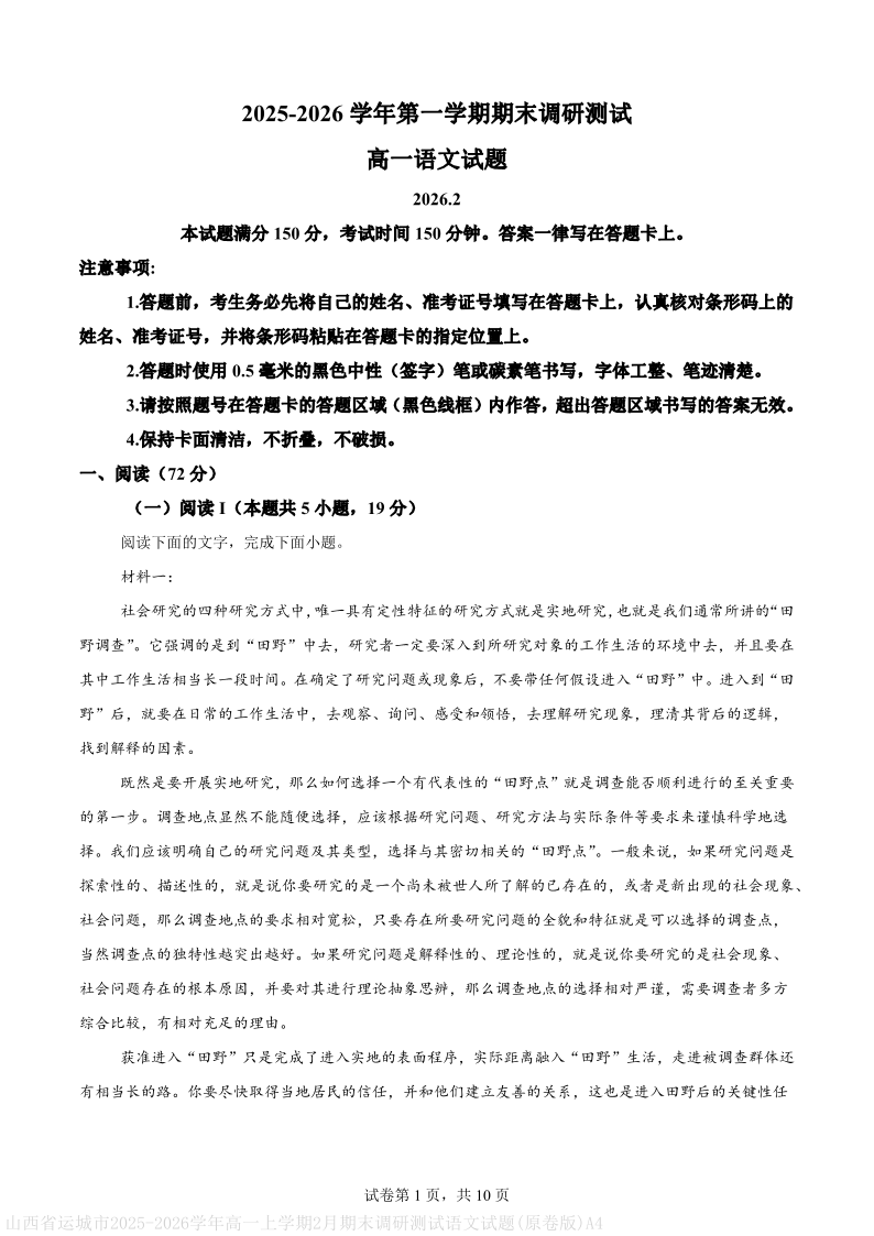 高一语文--山西省运城市2025-2026学年高一第一学期期末调研测试+