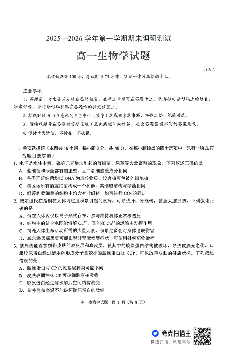 高一生物--山西省运城市2025-2026学年高一第一学期期末调研测试