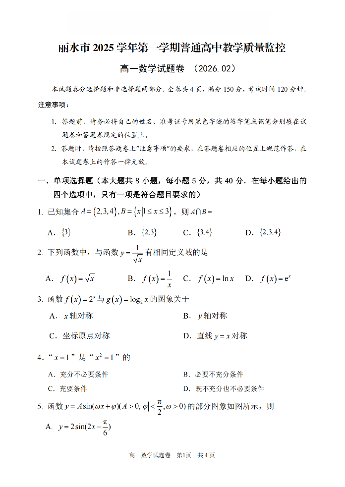 高一数学--浙江省丽水市2025-2026学年上学期高一期末教学质量监控