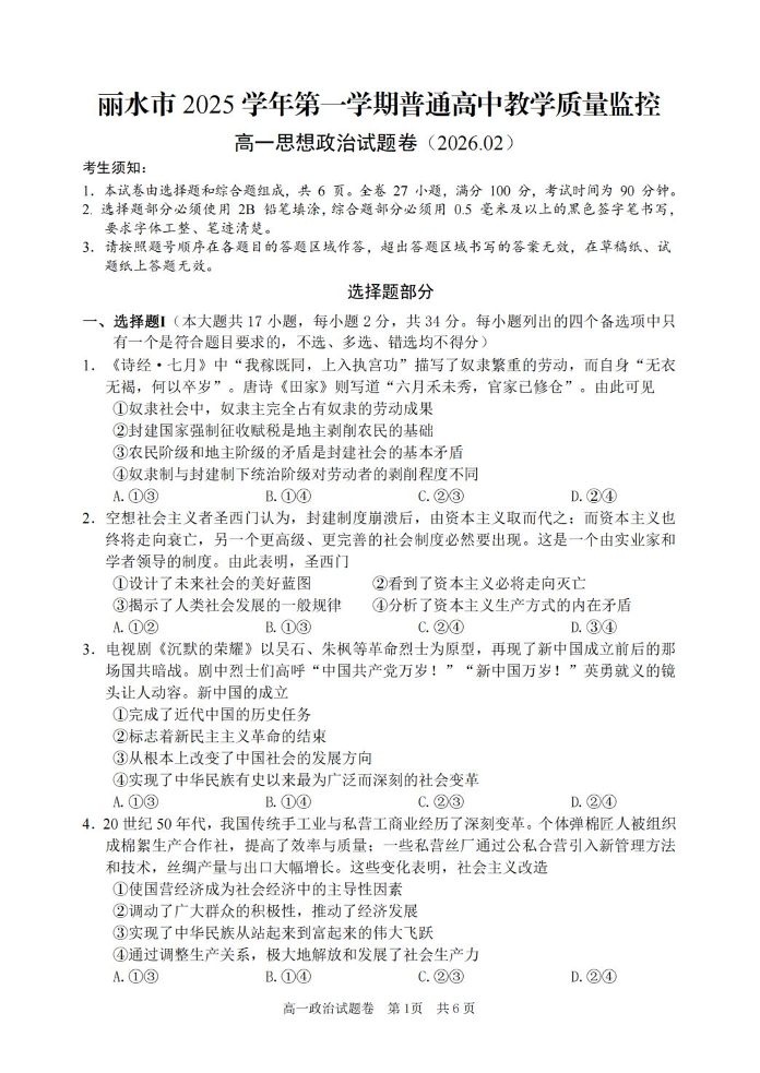 高一政治+答案--浙江省丽水市2025-2026学年上学期高一期末教学质量监控