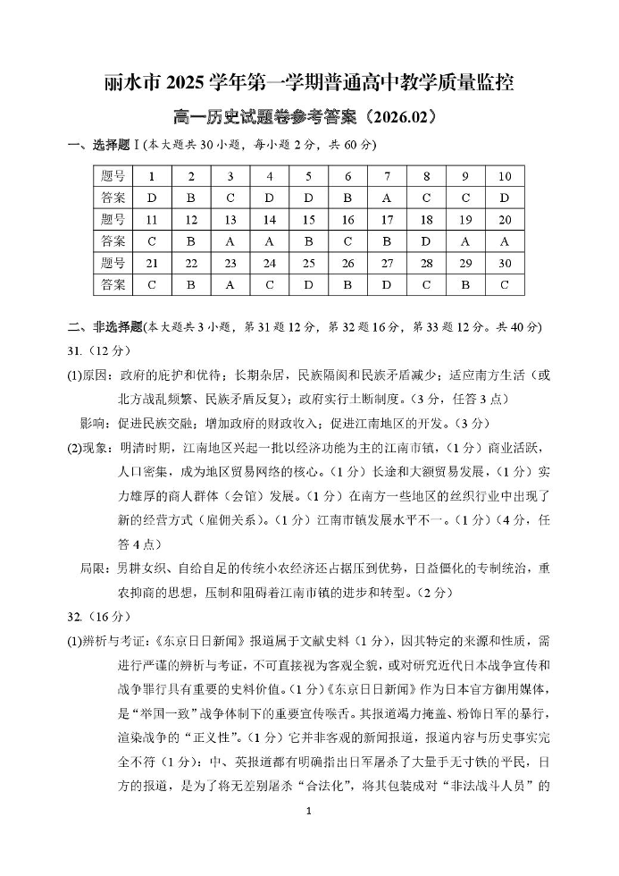 高一历史答案--浙江省丽水市2025-2026学年上学期高一期末教学质量监控