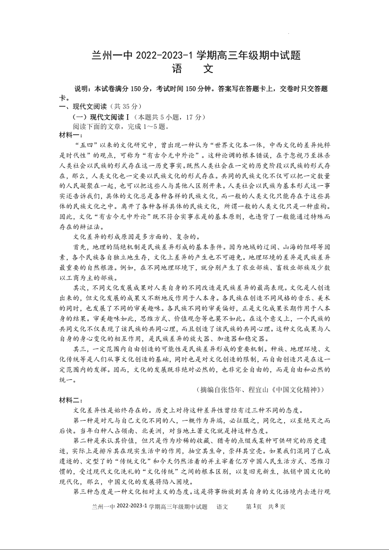 高三语文--甘肃省兰州第一中学高三上学期期中考试