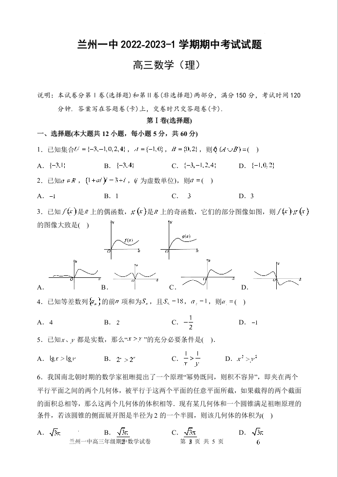 高三理数--甘肃省兰州第一中学高三上学期期中考试
