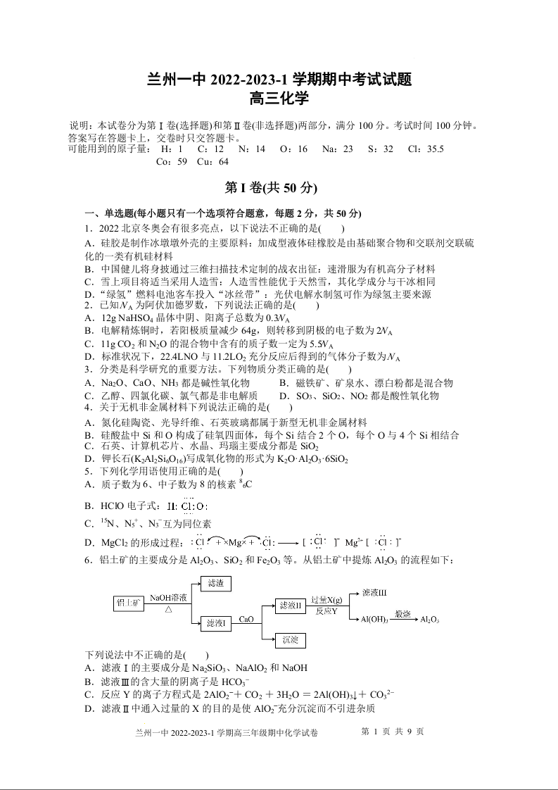 高三化学--甘肃省兰州第一中学高三上学期期中考试