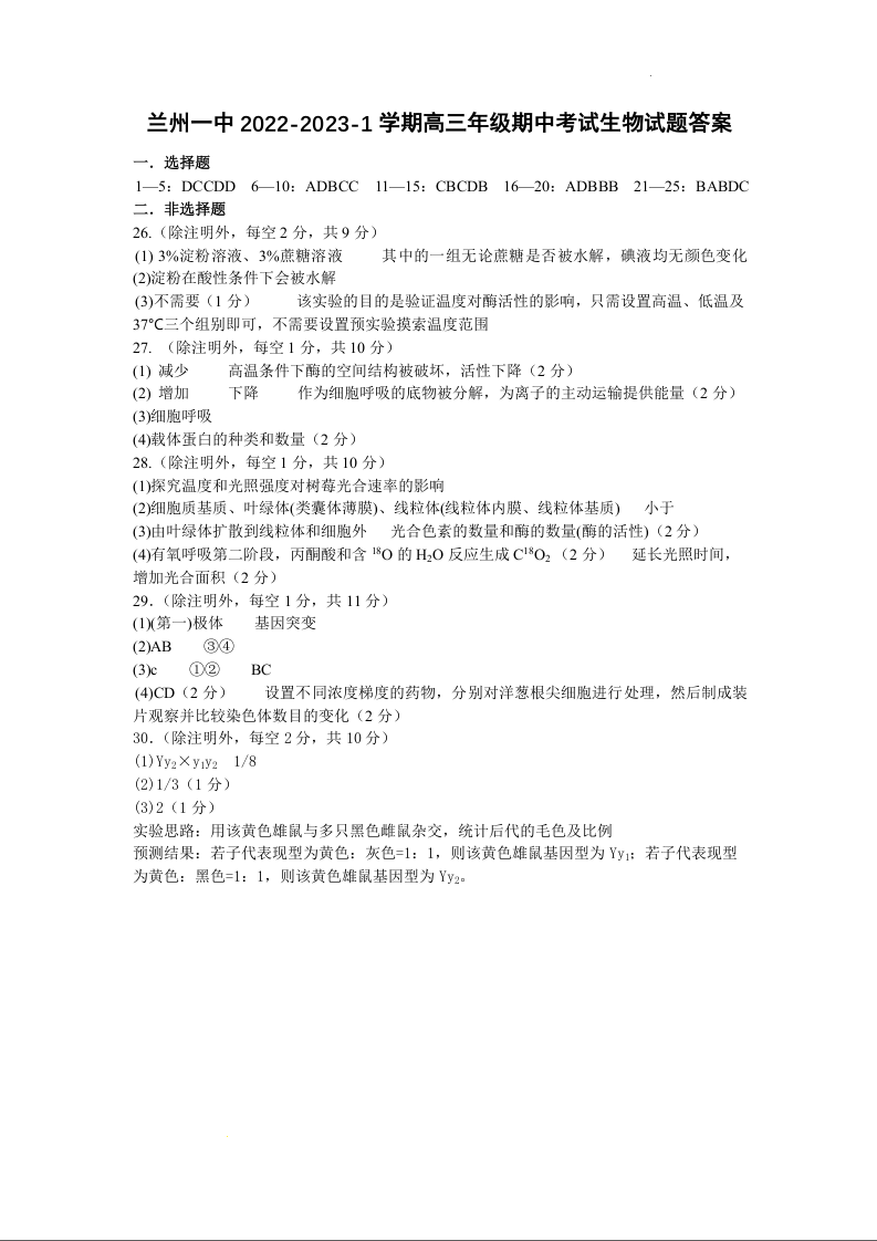 高三生物答案--甘肃省兰州第一中学高三上学期期中考试