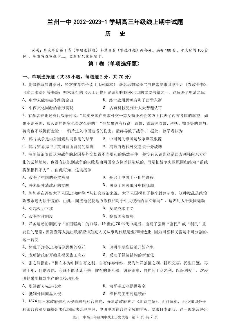 高三历史--甘肃省兰州第一中学高三上学期期中考试