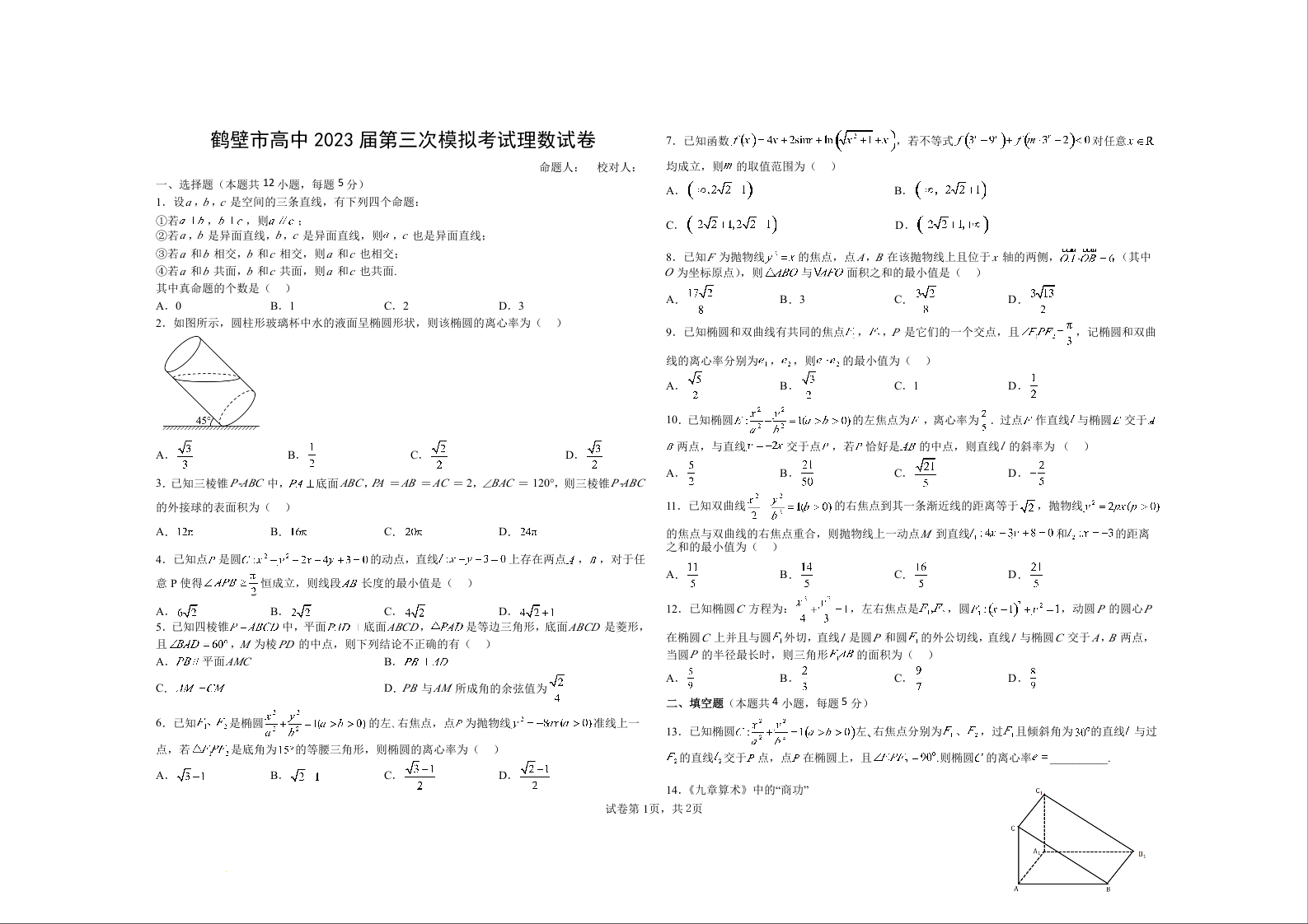 高三理数--河南省鹤壁市高中高三上学期第三次模拟考试