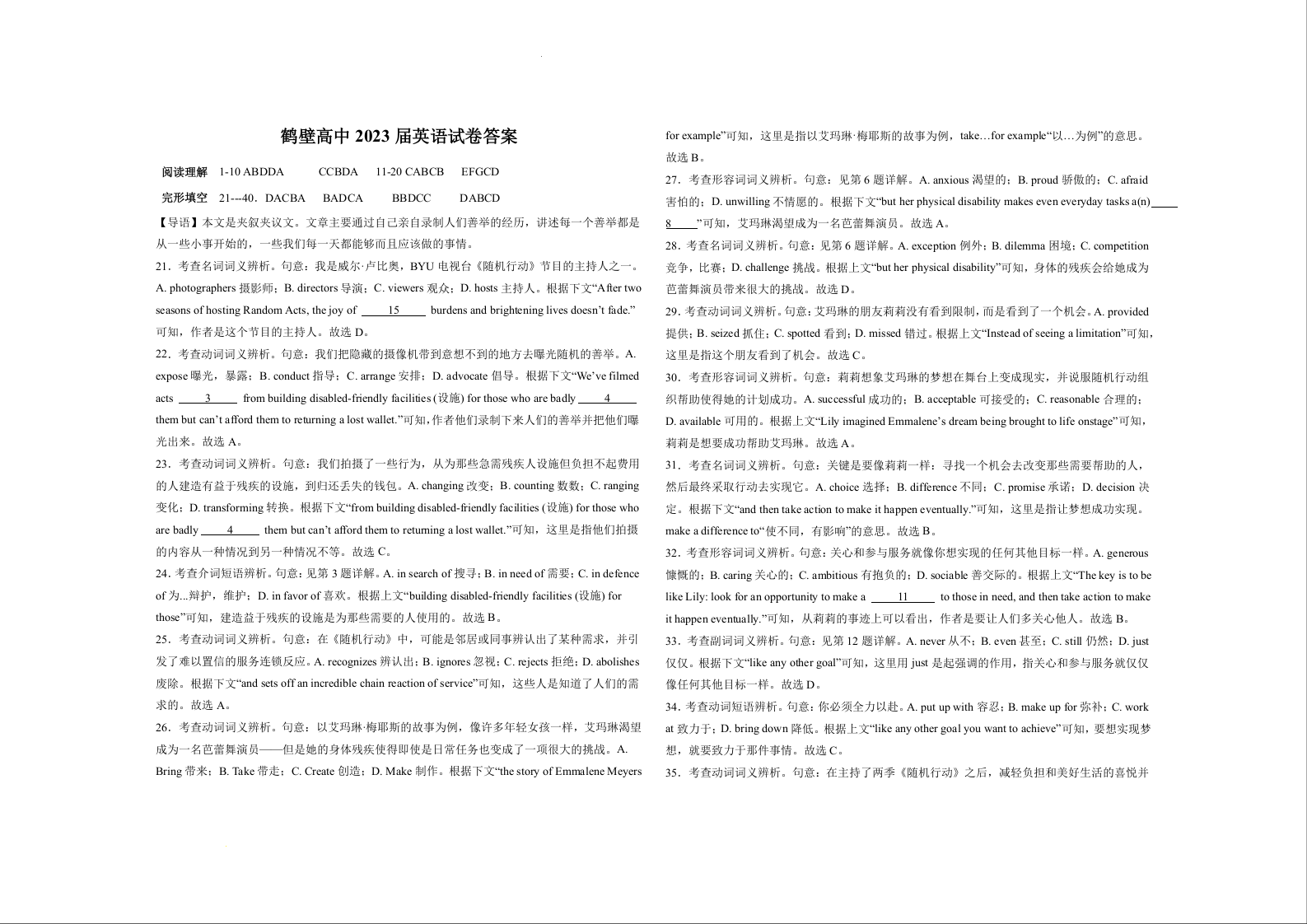 高三英语答案--河南省鹤壁市高中高三上学期第三次模拟考试