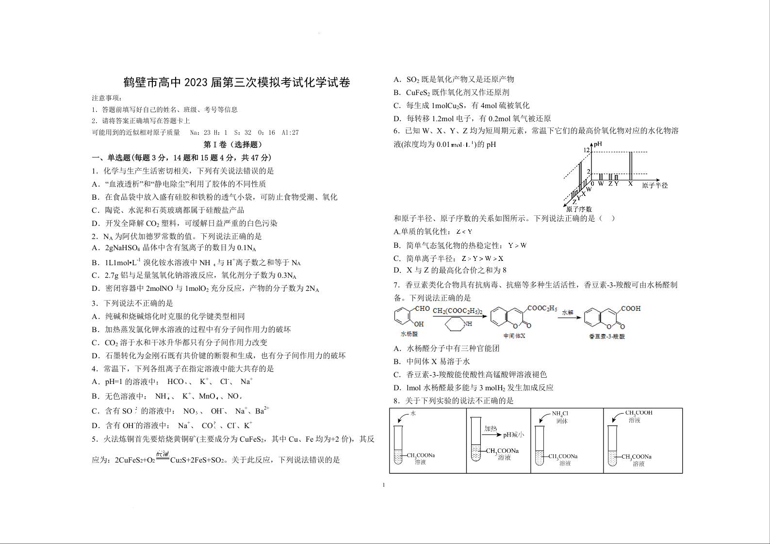 高三化学--河南省鹤壁市高中高三上学期第三次模拟考试