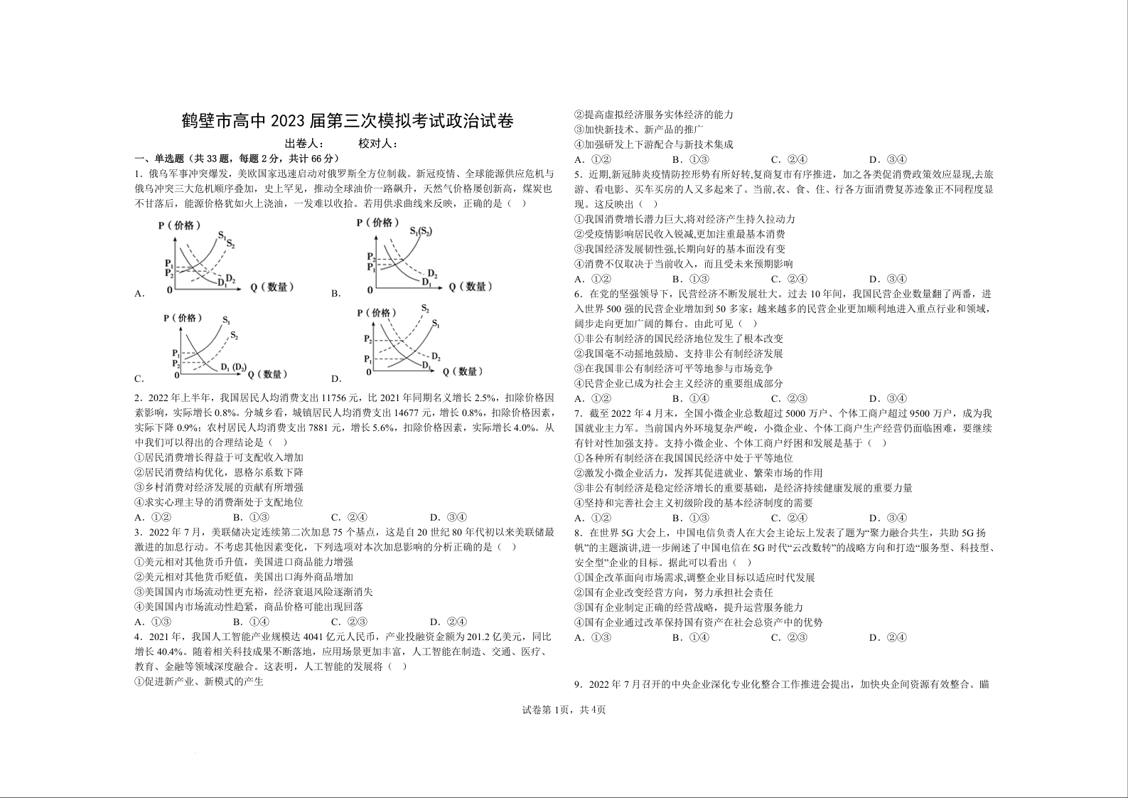 高三政治+答案--河南省鹤壁市高中高三上学期第三次模拟考试