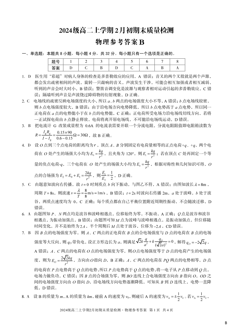 高二物理B答案--安徽省A10联盟2025-2026学年高二上学期2月初期末质量检测