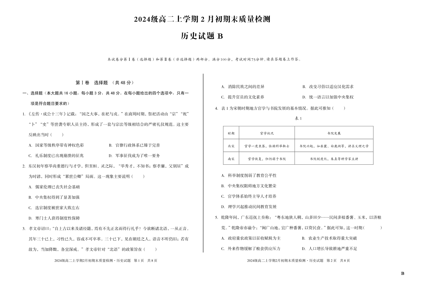 高二历史B--安徽省A10联盟2025-2026学年高二上学期2月初期末质量检测