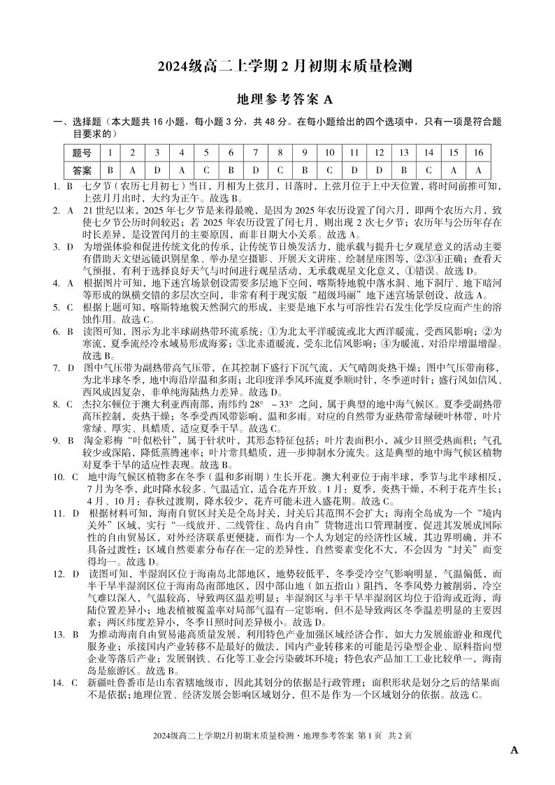 高二地理A答案--安徽省A10联盟2025-2026学年高二上学期2月初期末质量检测