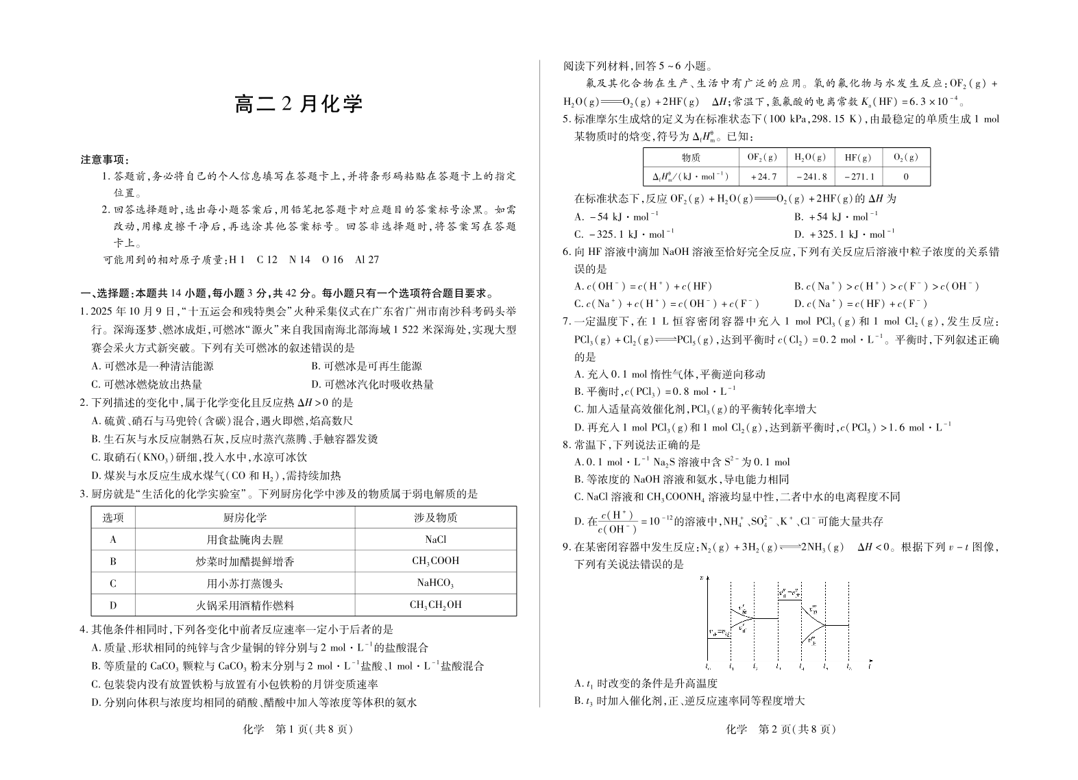 高二化学--安徽省合肥六中等学校2025-2026学年高二上学期2月期末考试