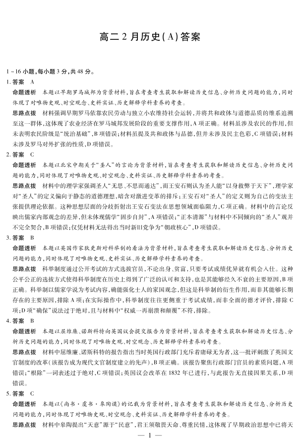 高二历史答案--安徽省合肥六中等学校2025-2026学年高二上学期2月期末考试