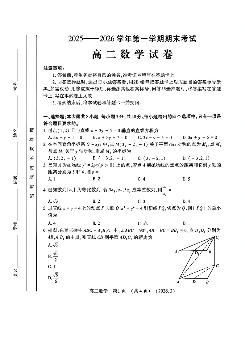 高二数学--河南省洛阳市2025-2026学年高二上学期2月期末考试