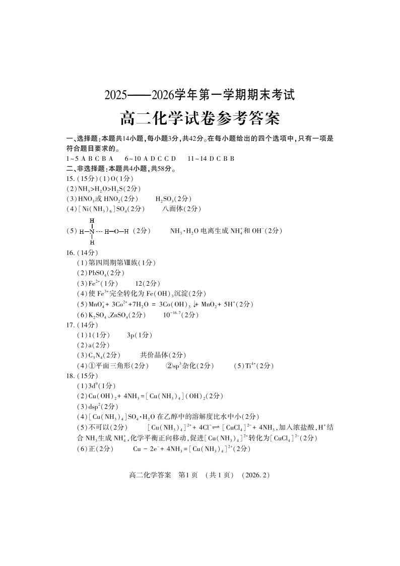 高二化学答案--河南省洛阳市2025-2026学年高二上学期2月期末考试