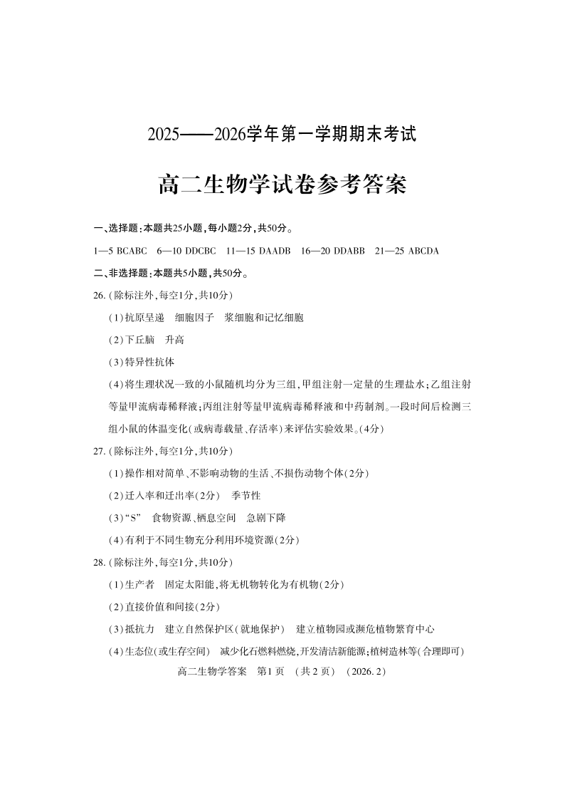 高二生物答案--河南省洛阳市2025-2026学年高二上学期2月期末考试