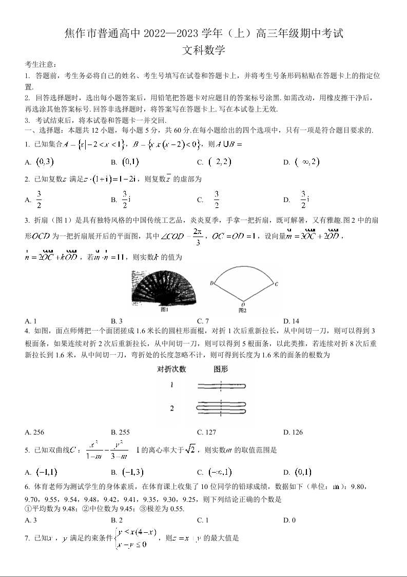 高三文数--河南省焦作市普通高中2022-2023学年高三上学期期中考试