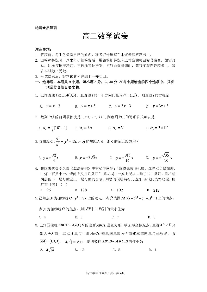 高二数学--湖北省黄石市2025-2026学年高二上学期2月期末考试