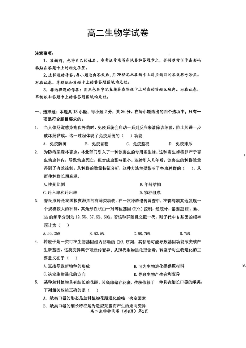 高二生物--湖北省黄石市2025-2026学年高二上学期2月期末考试