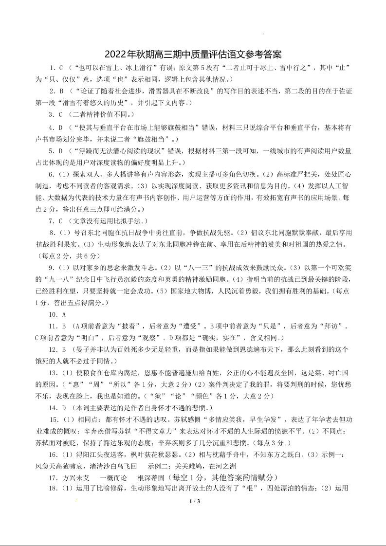 高三语文答案--河南省南阳市2022-2023学年高三上学期11月期中