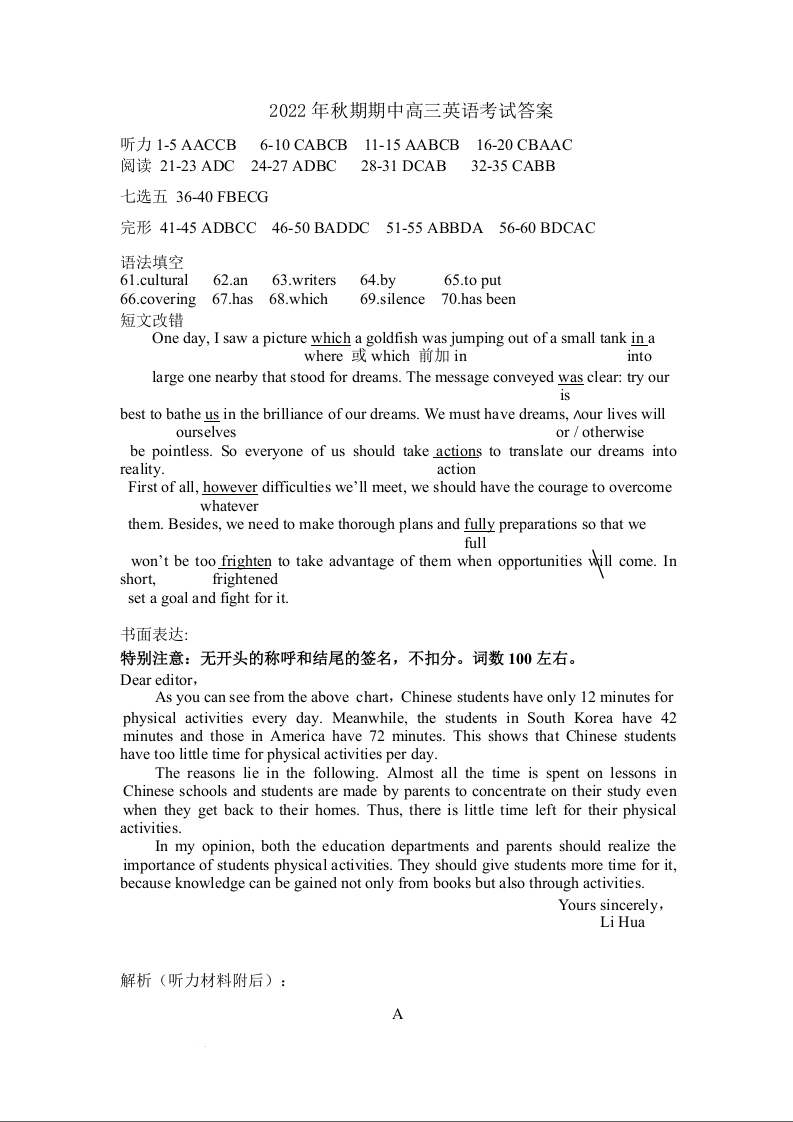 高三英语答案--河南省南阳市2022-2023学年高三上学期11月期中