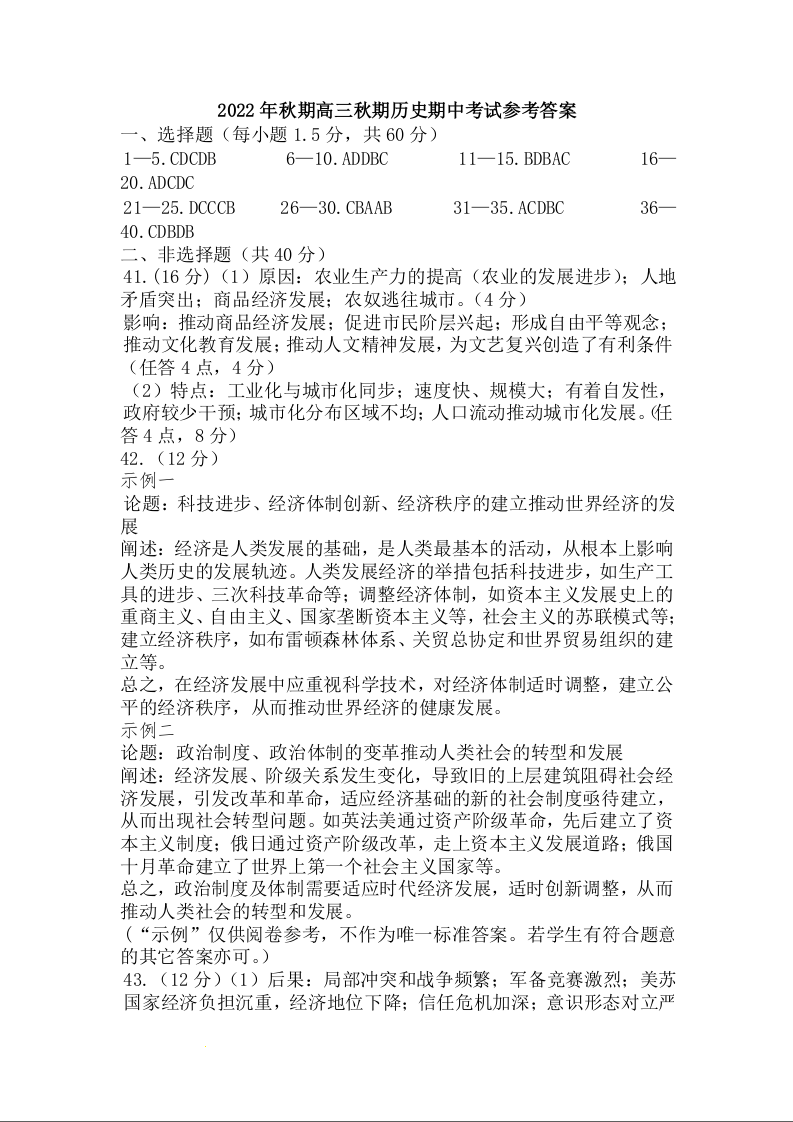 高三历史答案--河南省南阳市2022-2023学年高三上学期11月期中