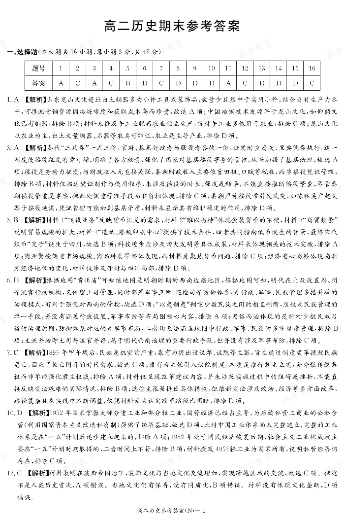 高二历史答案--湖南省长郡中学2025-2026高二上学期期末考试