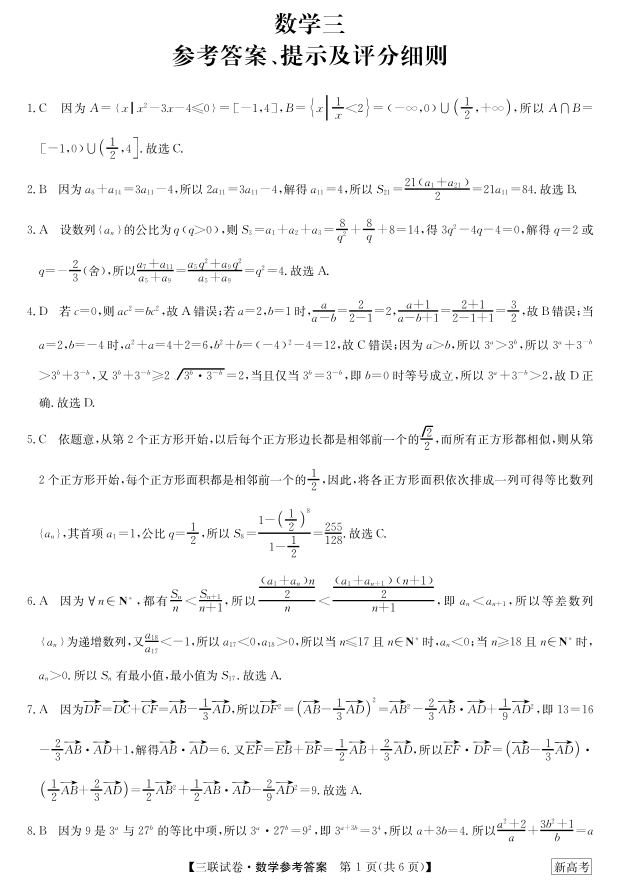 高三数学答案--黑龙江省齐齐哈尔市高三上学期11月第三次联考