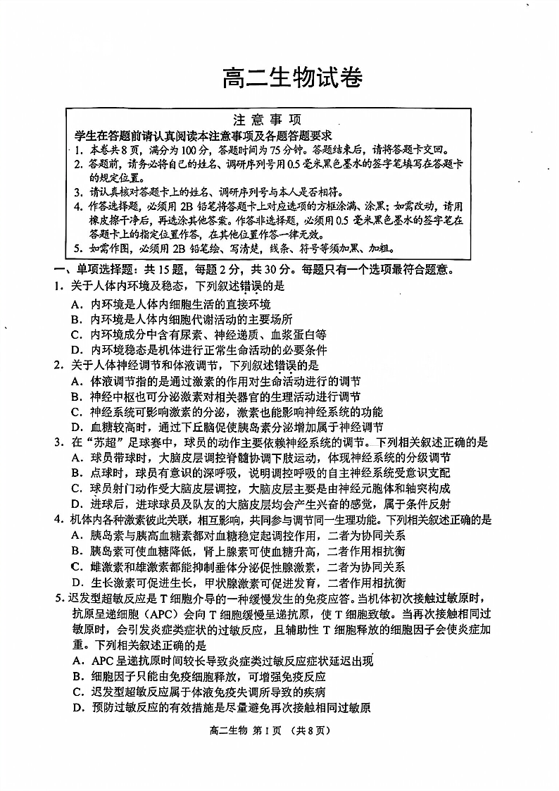 高二生物--江苏省苏州市2025-2026学年度高二上学期期末考试