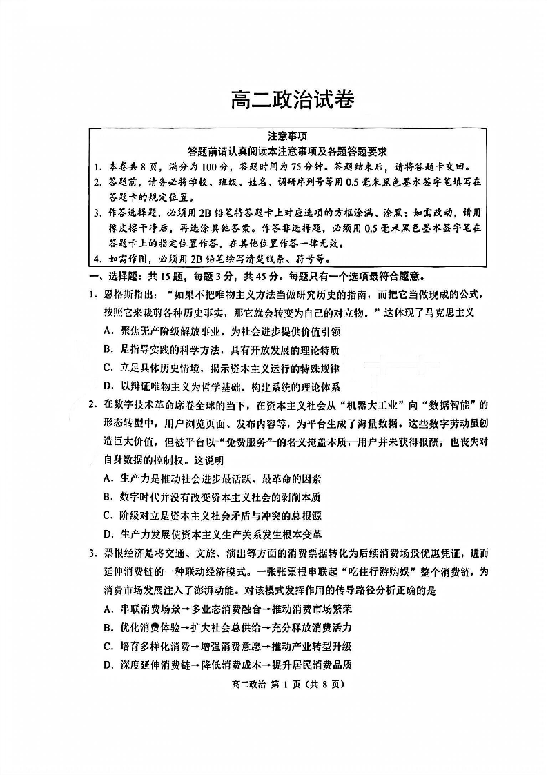 高二政治--江苏省苏州市2025-2026学年度高二上学期期末考试