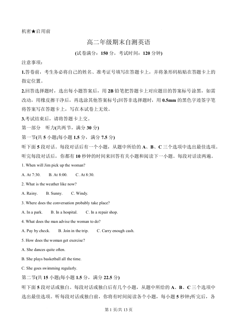 高二英语(原卷版)--山西省晋城市2025-2026学年高二上学期2月期末自测