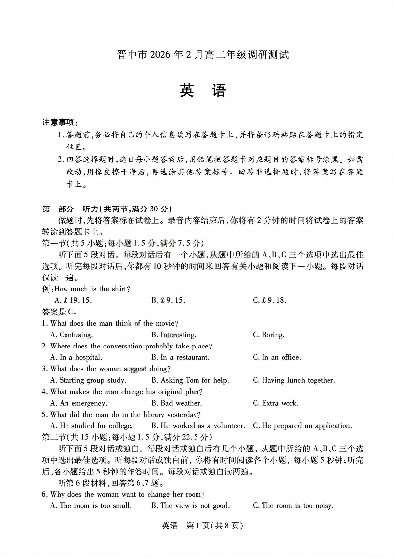 高二英语--西省晋中市2026年2月高二年级调研测试