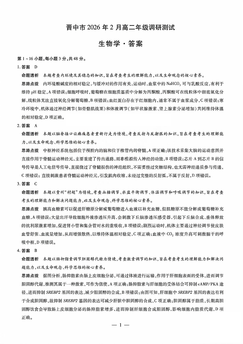 高二生物答案--西省晋中市2026年2月高二年级调研测试
