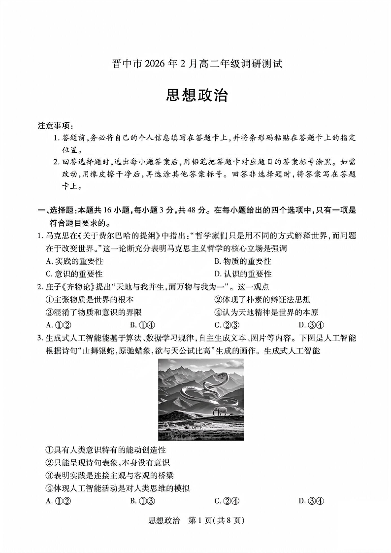 高二政治--西省晋中市2026年2月高二年级调研测试