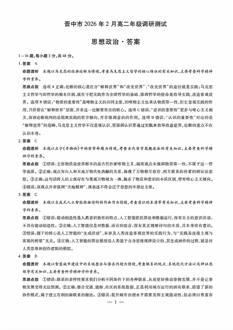 高二政治答案--西省晋中市2026年2月高二年级调研测试