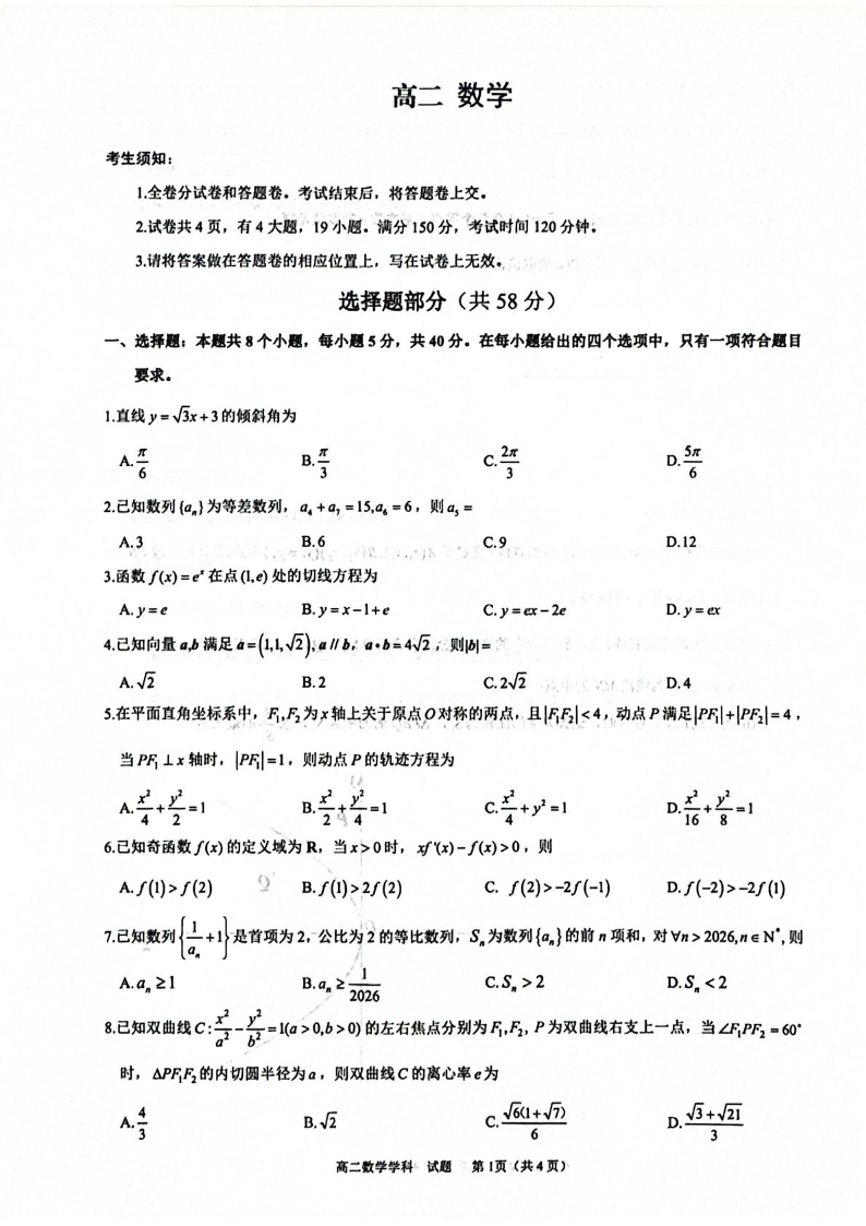 高二数学--浙江衢州市2025-2026学年高二上学期2月期末考试