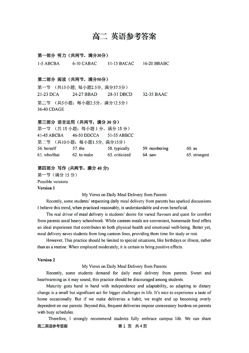 高二英语答案--浙江衢州市2025-2026学年高二上学期2月期末考试