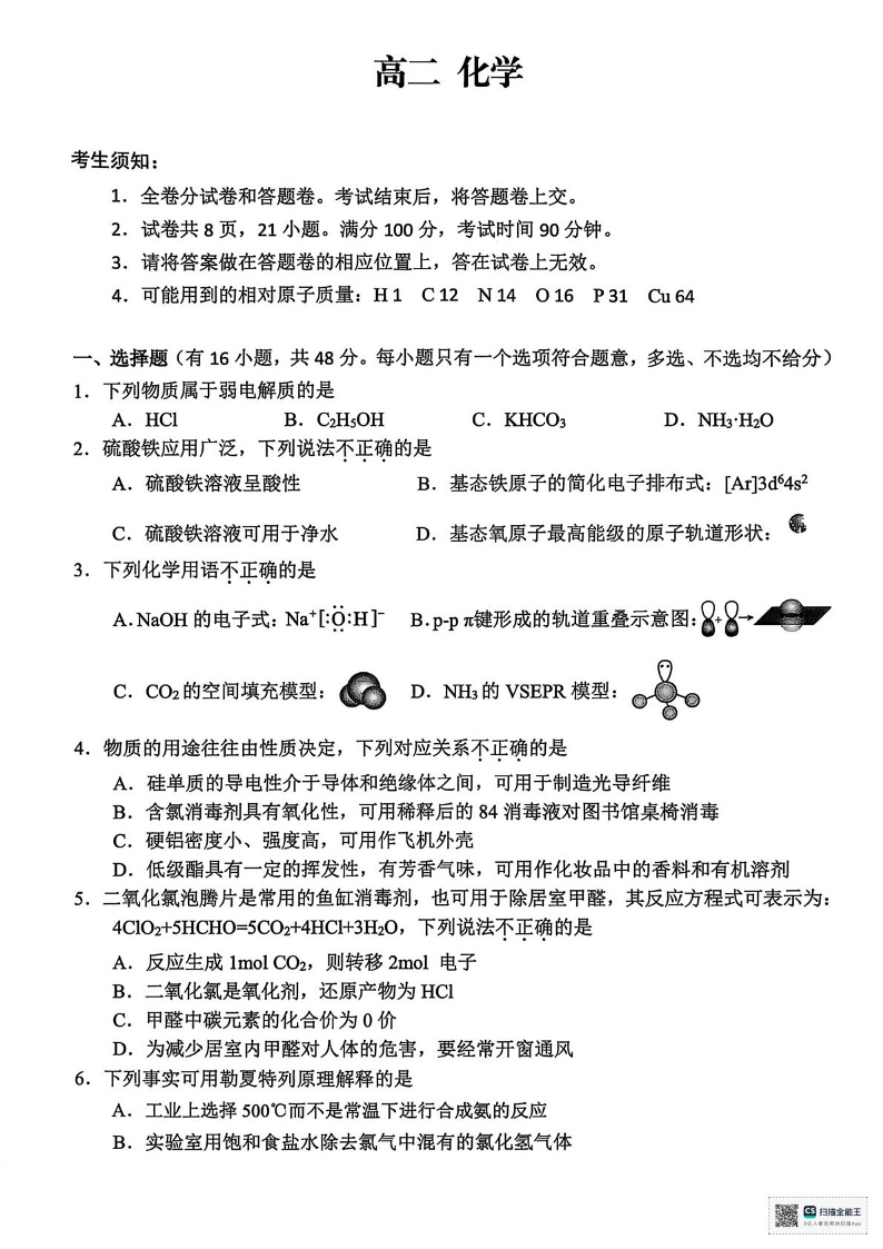 高二化学+答案--浙江衢州市2025-2026学年高二上学期2月期末考试