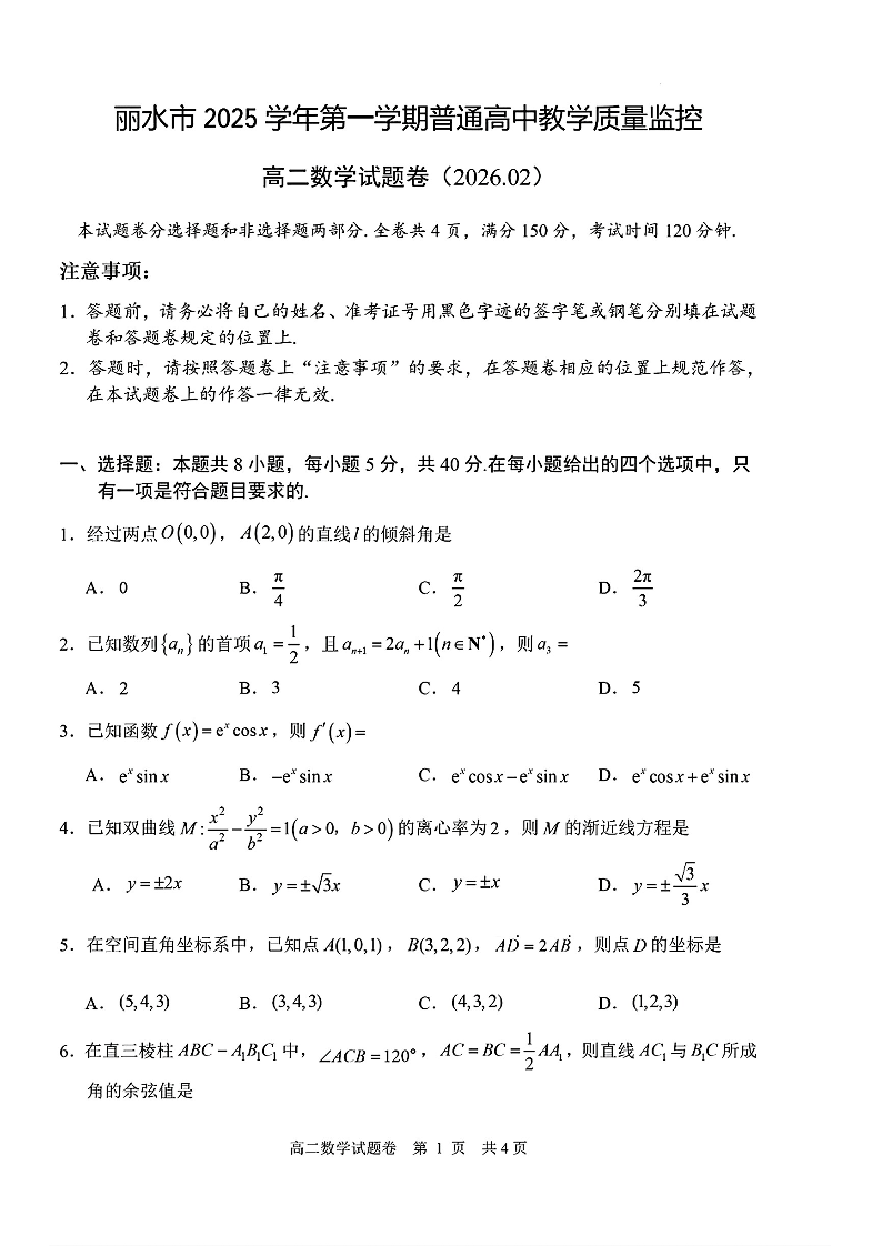 高二数学+答案--浙江省丽水市2025-2026学年上学期高二期末教学质量监控