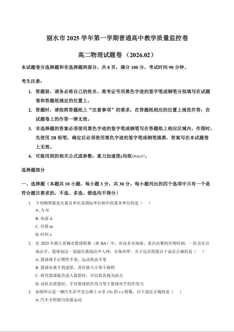 高二物理+答案--浙江省丽水市2025-2026学年上学期高二期末教学质量监控