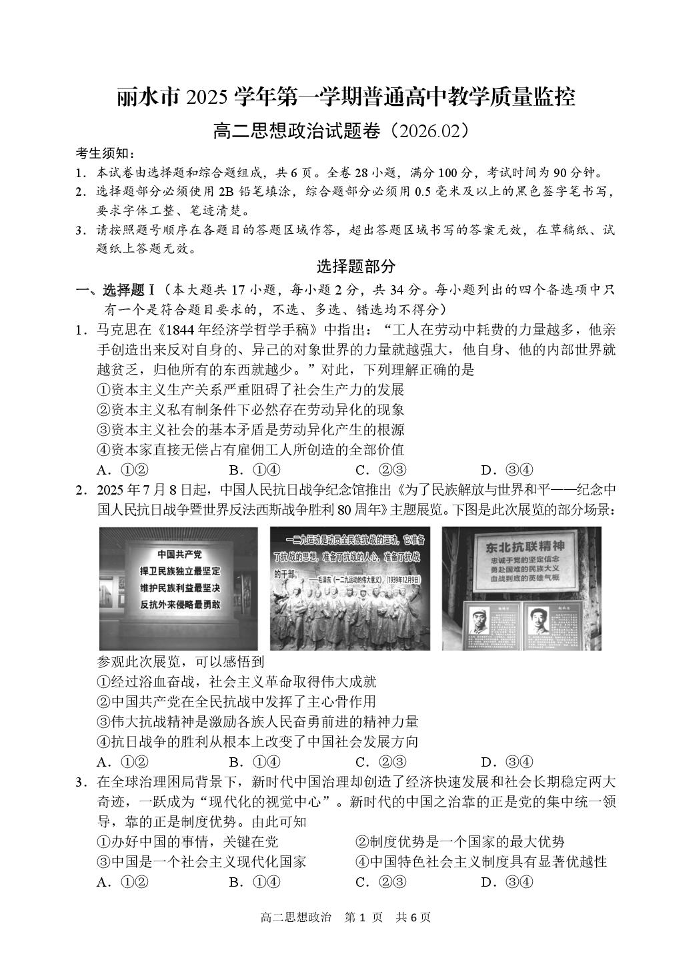 高二思想政治--浙江省丽水市2025-2026学年上学期高二期末教学质量监控