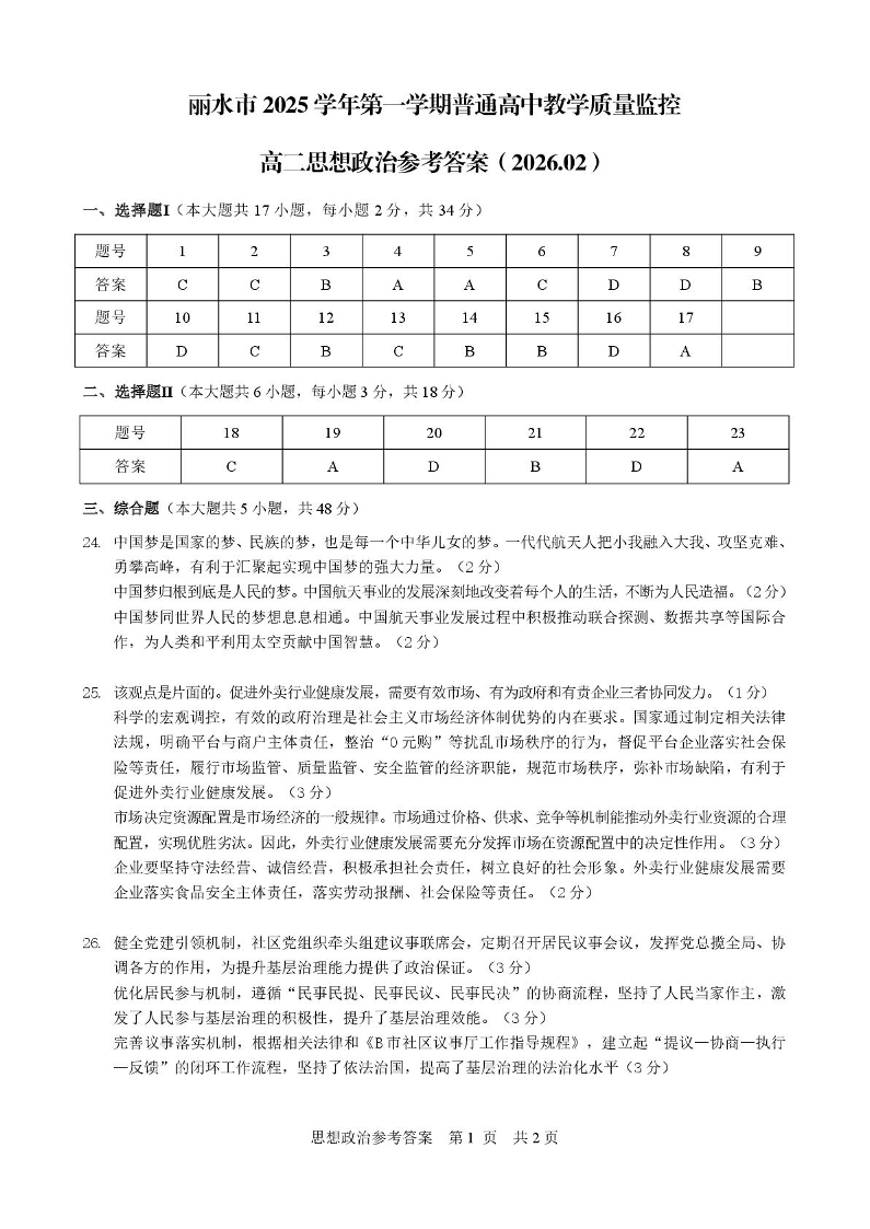高二思想政治答案--浙江省丽水市2025-2026学年上学期高二期末教学质量监控