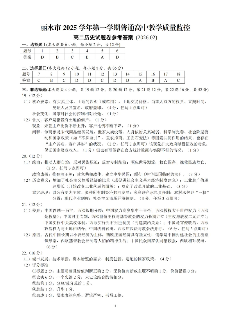 高二历史答案--浙江省丽水市2025-2026学年上学期高二期末教学质量监控