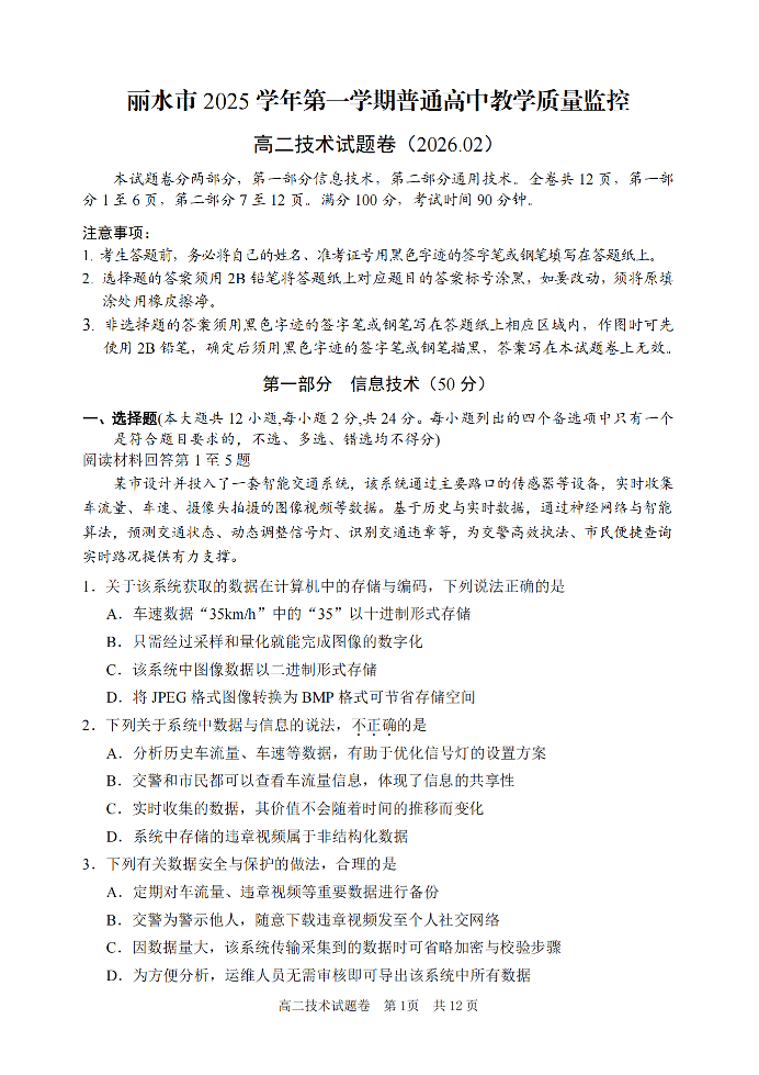 高二技术--浙江省丽水市2025-2026学年上学期高二期末教学质量监控
